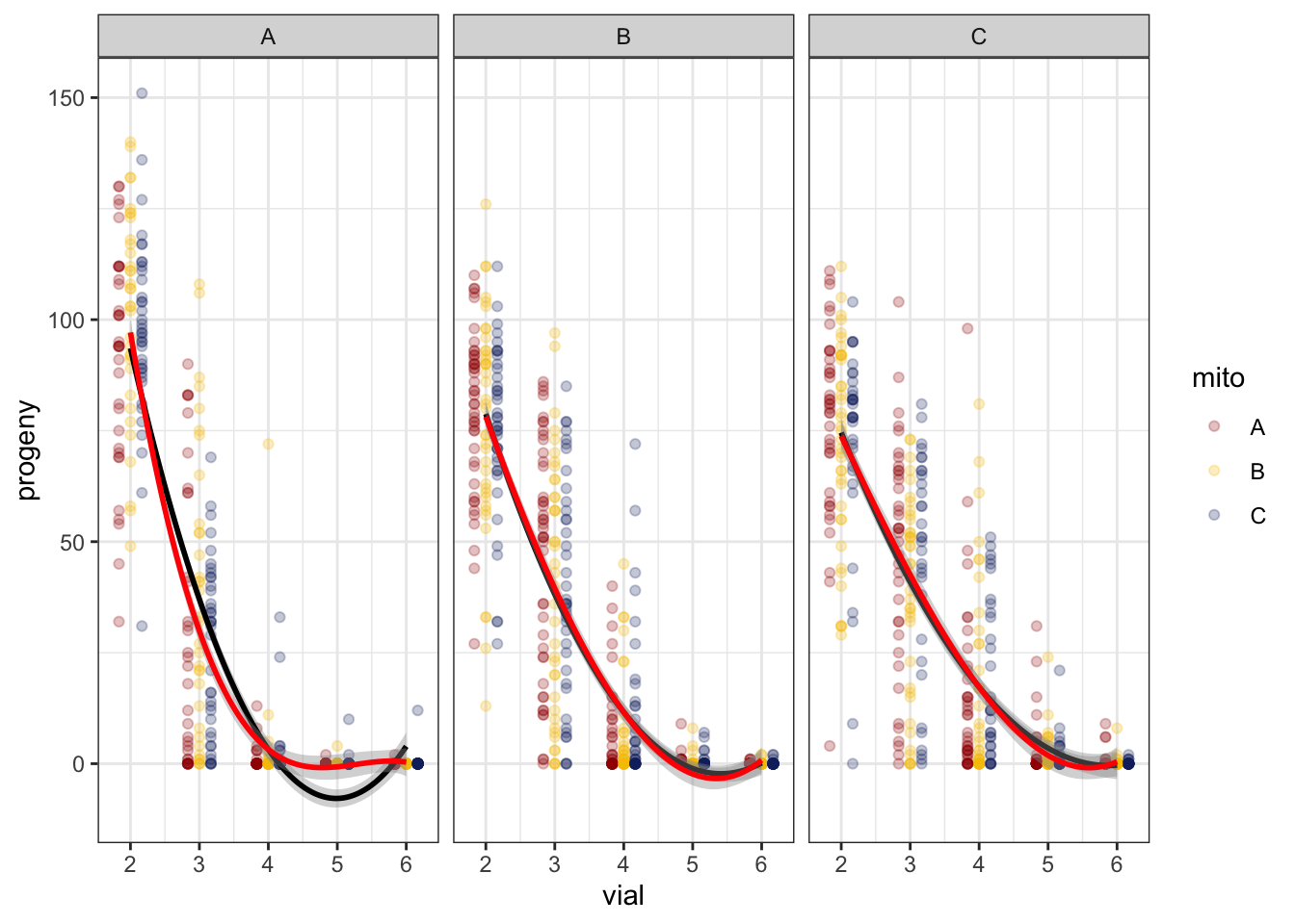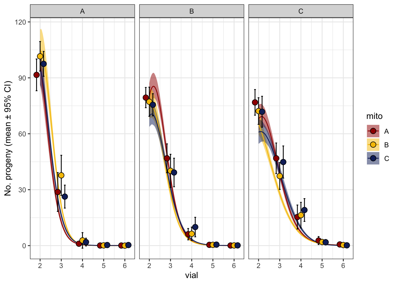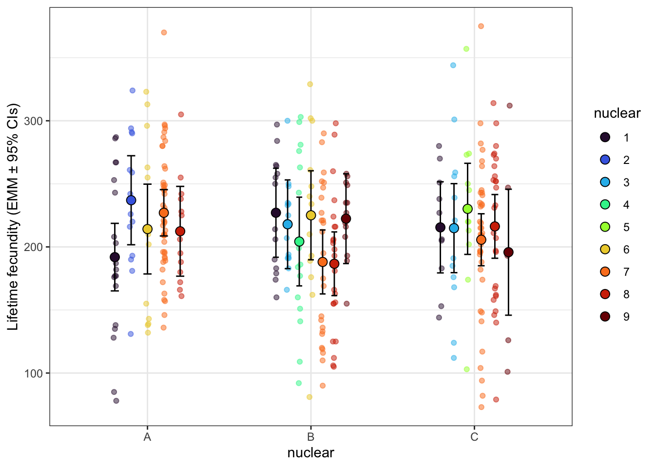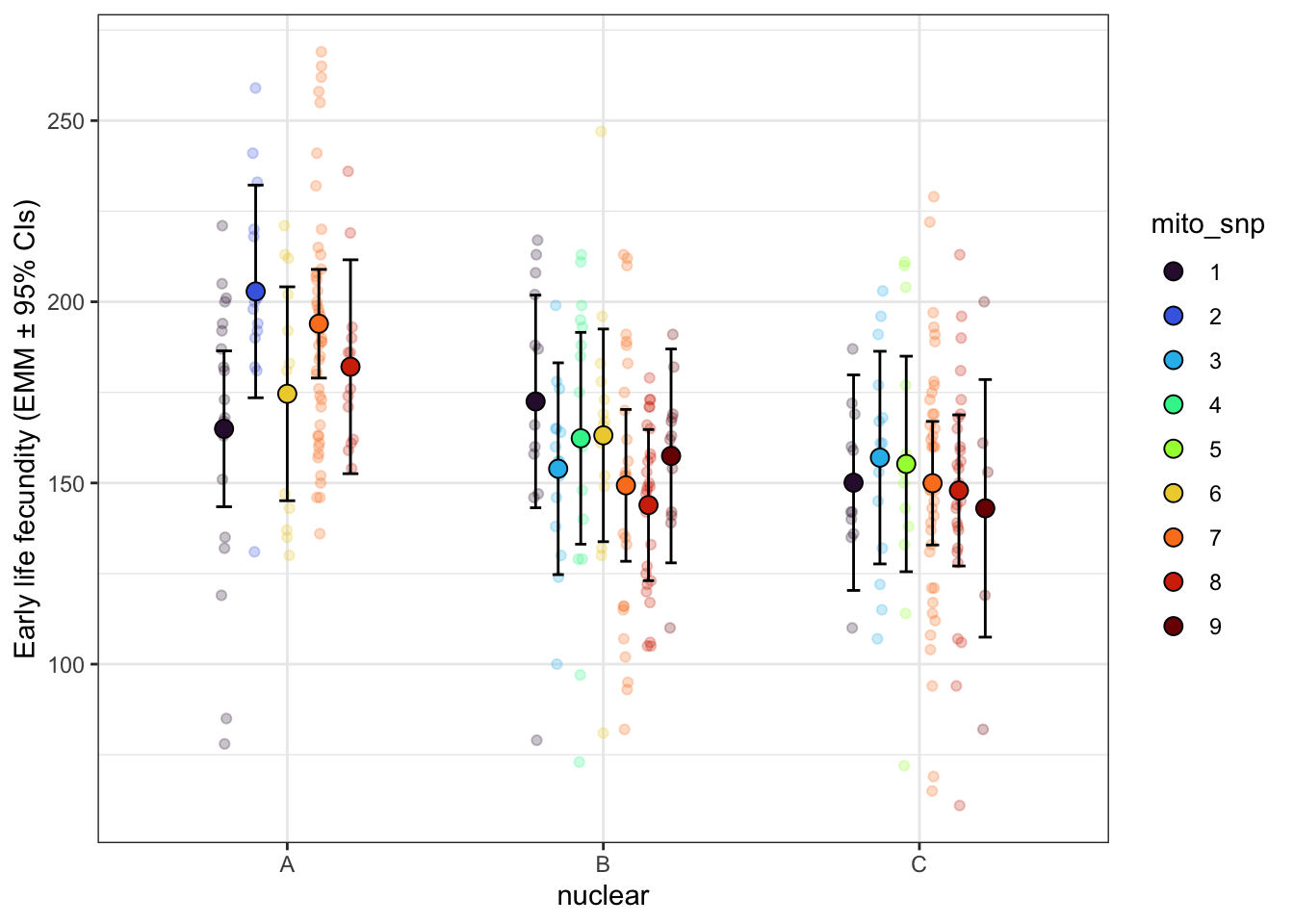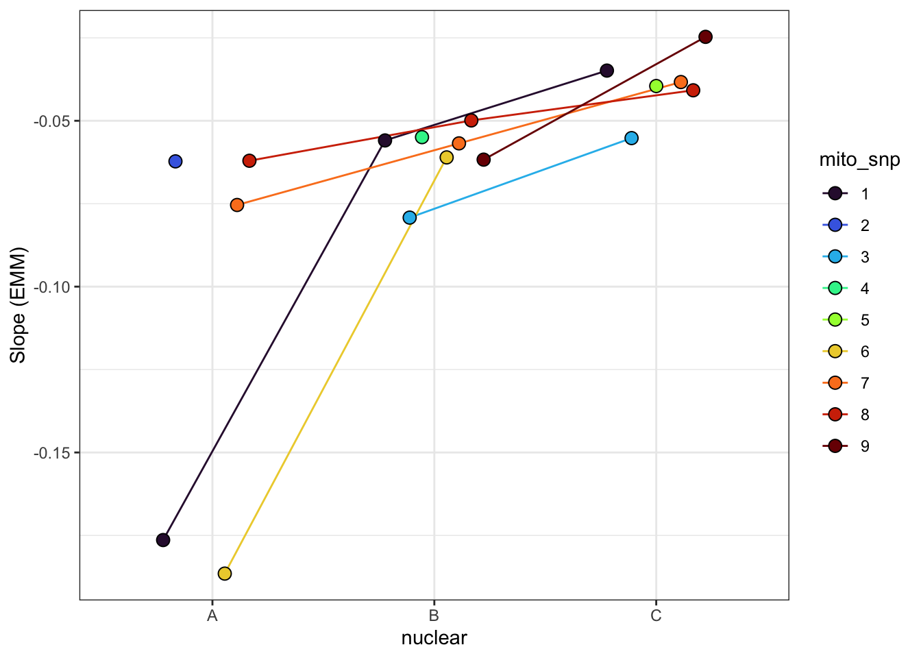 $emmeans nuclear emmean SE df asymp.LCL asymp.UCL A 0.610 0.0840 Inf 0.446 0.7749 B -0.103 0.0723 Inf -0.245 0.0387 C -0.473 0.0811 Inf -0.632 -0.3138 Results are averaged over the levels of: mito Results are given on the log (not the response) scale. Confidence level used: 0.95 $contrasts contrast estimate SE df z.ratio p.value A - B 0.713 0.136 Inf 5.254 <.0001 A - C 1.083 0.142 Inf 7.601 <.0001 B - C 0.370 0.133 Inf 2.786 0.0147 Results are averaged over the levels of: mito Results are given on the log (not the response) scale. P value adjustment: tukey method for comparing a family of 3 estimates