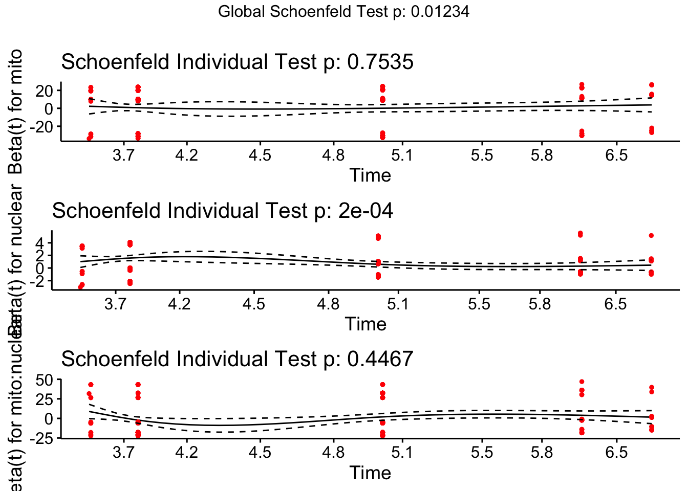 test.ph <- cox.zph(coxph(Surv(vial, EVENT) ~ mito * nuclear, data = fsurv))