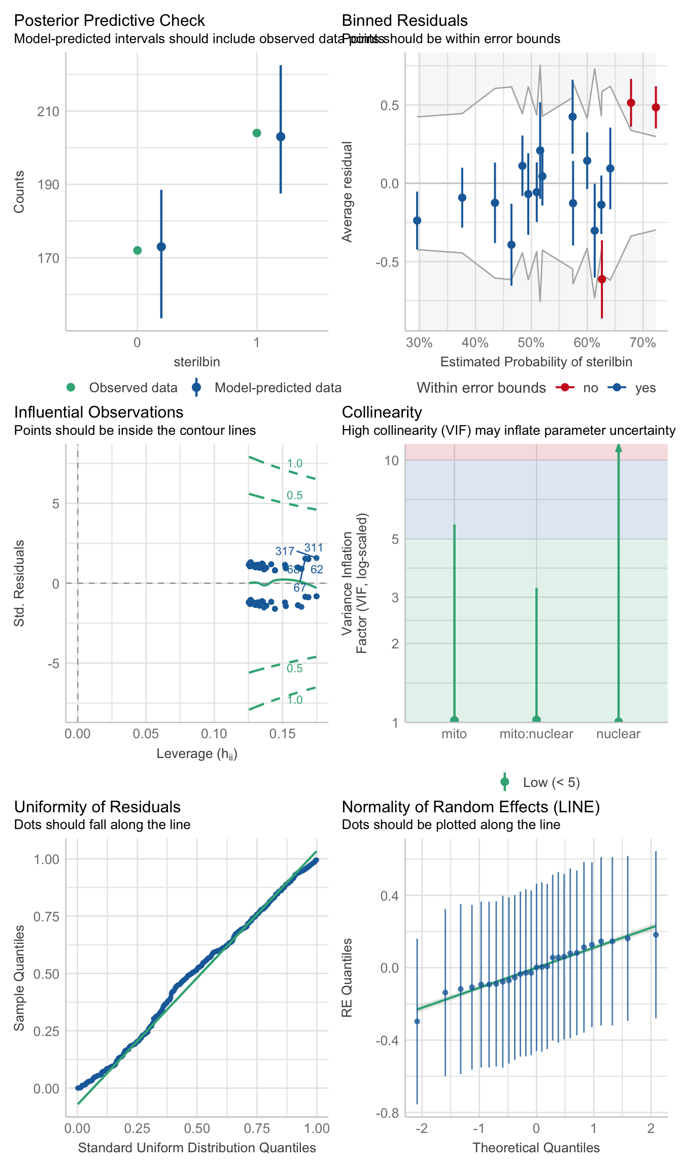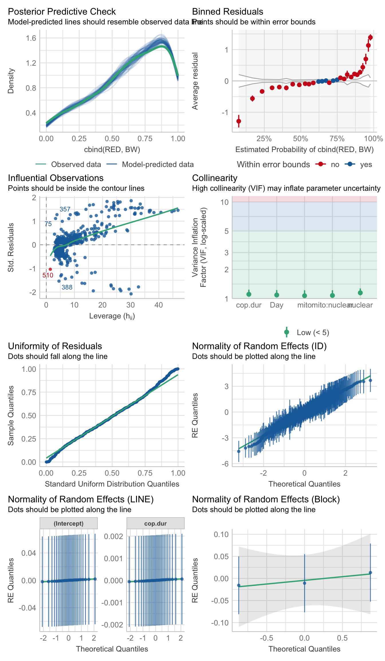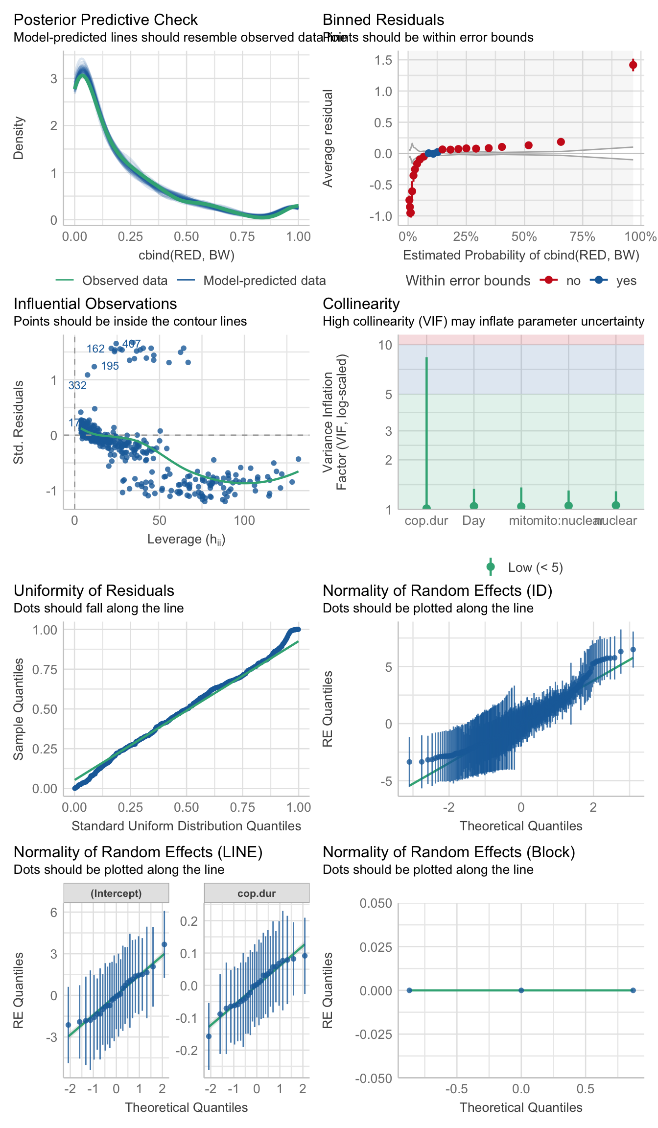 p2.mod1 <- glmer(cbind(RED, BW) ~ mito * nuclear + Day + cop.dur + (1 + cop.dur|LINE) + (1|ID) + (1|Block),