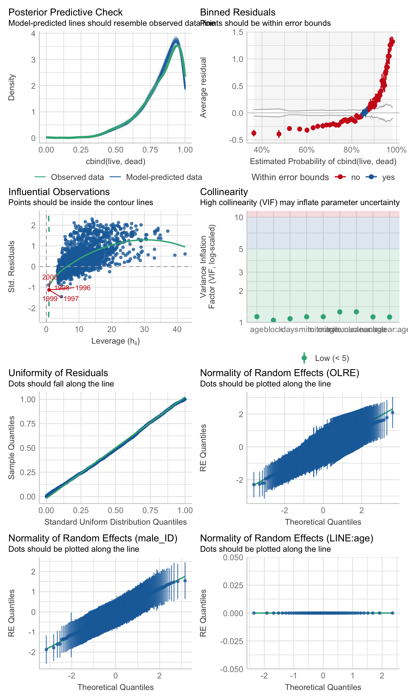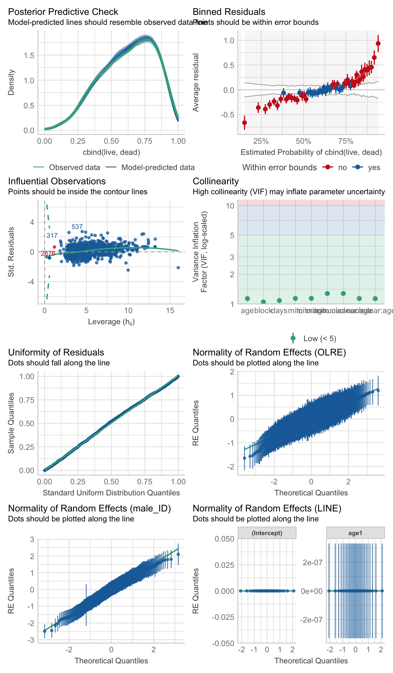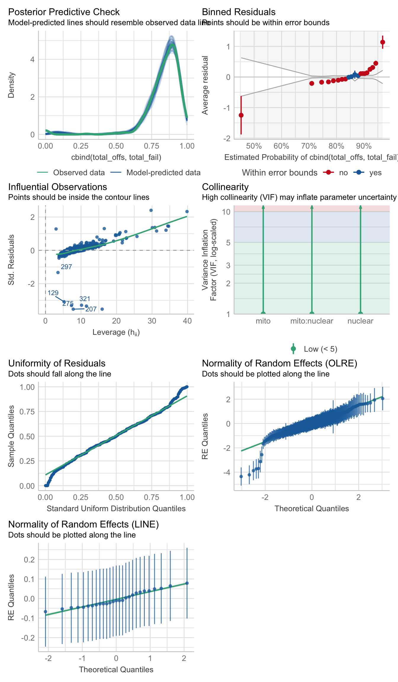 p2.mod1 <- glmer(cbind(RED, BW) ~ mito * nuclear + Day + cop.dur + (1 + cop.dur|LINE) + (1|ID) + (1|Block),