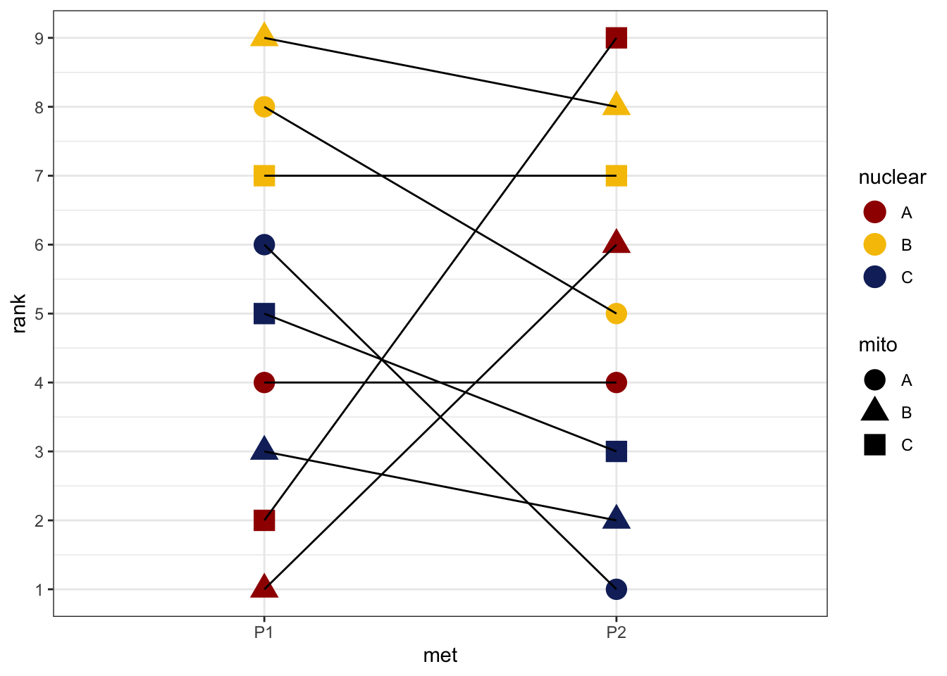 geom_point(size = 5, aes(shape = mito, colour = nuclear)) +